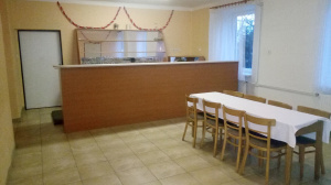 Vybavení šenku: lednička a mycí dřez s teplou vodou.