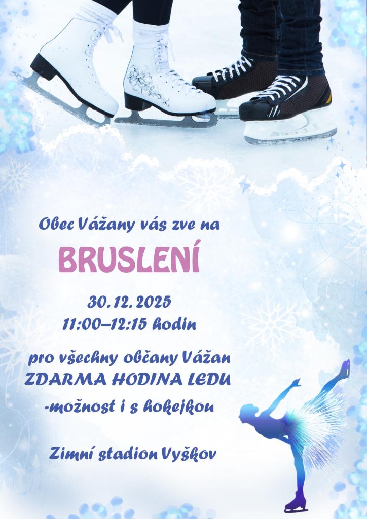 Obec Vážany zve všechny občany na bruslení na zimním stadionu ve Vyškově. Akce se koná 30. prosince 2025 od 11:00 do 12:15 hodin. Zváni jsou také děti s rodiči, kteří navštěvují cvičení Sokola Vážany, klub stolního tenisu a mateřskou školu Vážany.